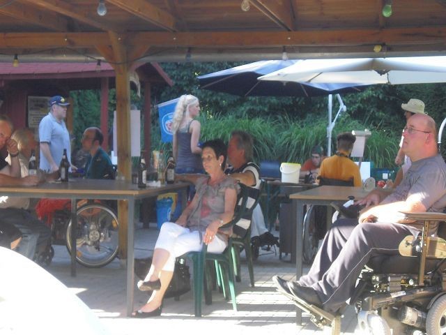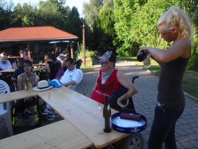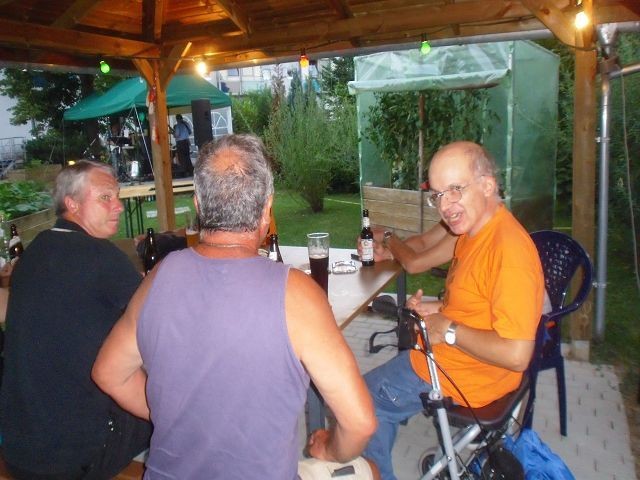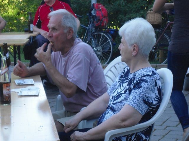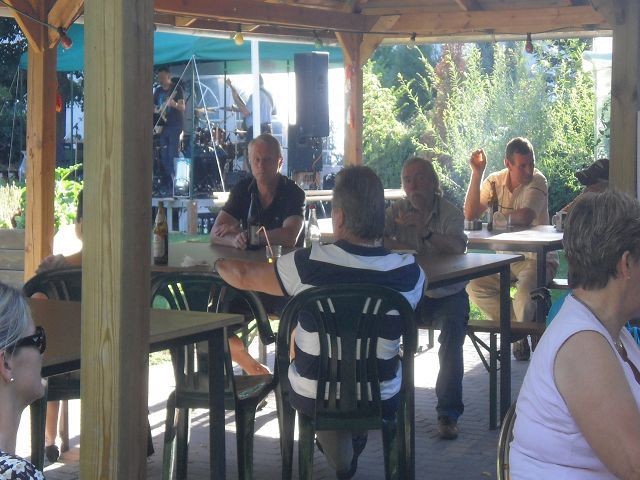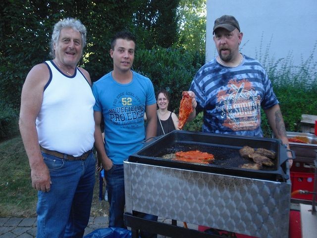 Am Nachmittag herrschte eine Gluthitze, die auch noch am frühen Abend keine Abkühlung brachte. Jeder der Konzertbesucher versuchte, auf dem sonnendurchfluteten Platz ein schattiges Fleckchen zu finden. Die Getränke flossen mit der Jagst um die Wette, sodass das „Brandenburger Team“ mit all seinen vielen Helferlein allerhand zu tun hatten, alle durstigen Kehlen, und hungrigen Mäuler zu stopfen. Unser Haumeister Mario erklärte sich bereit, den schweißtreibenden Job des Grillmeisters zu übernehmen.