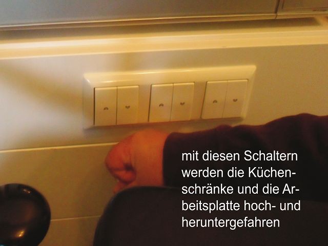 In der Wohnung sind nun alle Elektroarbeiten fertig, so probierten wir bei der Gelegenheit gleich die Schalter für das Absenken der Hängeschränke und der Arbeitsplatte aus. Sehr sinnvoll und praktisch scheint uns die automatische Stoppfunktion beim Absenken der Hängeschränke zu sein.
