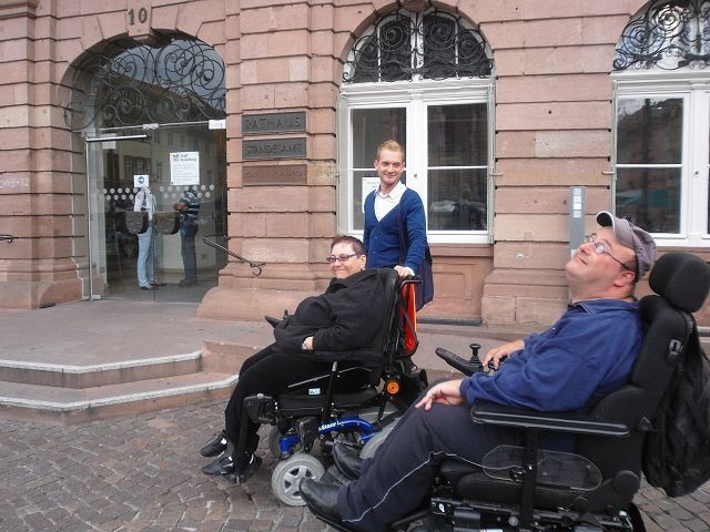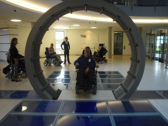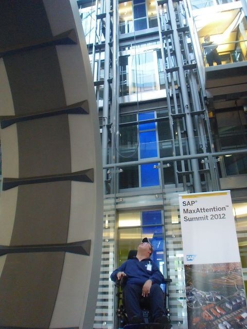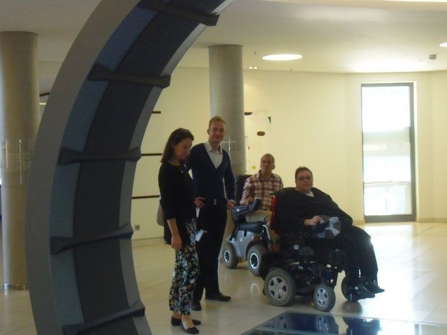 Lukas nahm uns gleich auf dem Parkplatz in Walldorf in Empfang und auf ging es, dem „blauen Datenstrom“ folgend direkt in eine Eingangshalle. Dort trafen wir den SAP Behindertenbeauftragten Siegfried Peisl. Bei einem kleinen Rundgang durch einige Gebäude, zeigten die beiden uns, was die SAP für Menschen mit Behinderung im Hinblick auf Barrierefreiheit gemacht hat.