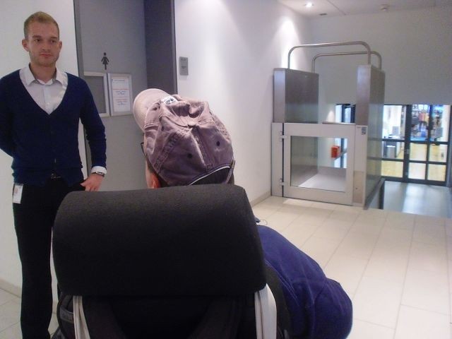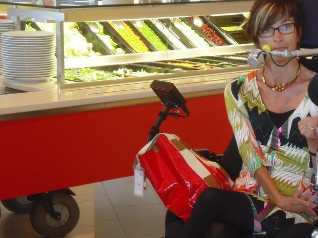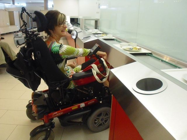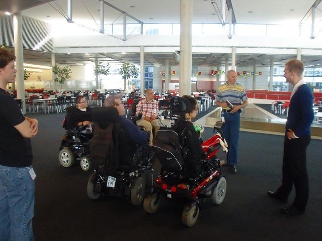 Uns hat natürlich vor allem das interessiert, was für die Rollstuhlfahrer gemacht wurde. Das geht schon in der Kantine los, dort sind z. B. an der Salattheke Spiegel so angebracht, dass man aus dem Sitzen in die Salatbehälter schauen kann. Ein Tisch, praktischerweise ganz in der Nähe der Essensausgabe, ist außerdem immer für Rollis reserviert. Auch die Rückgabe des Essens-Tablett ist für Rollifahrer möglich. Und über eine Rampe mit Ausruhplattform, kann man bequem alle Bereiche der Kantine erreichen.