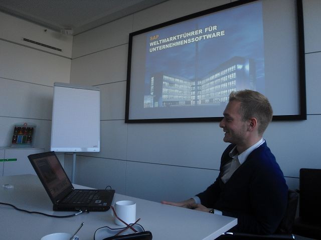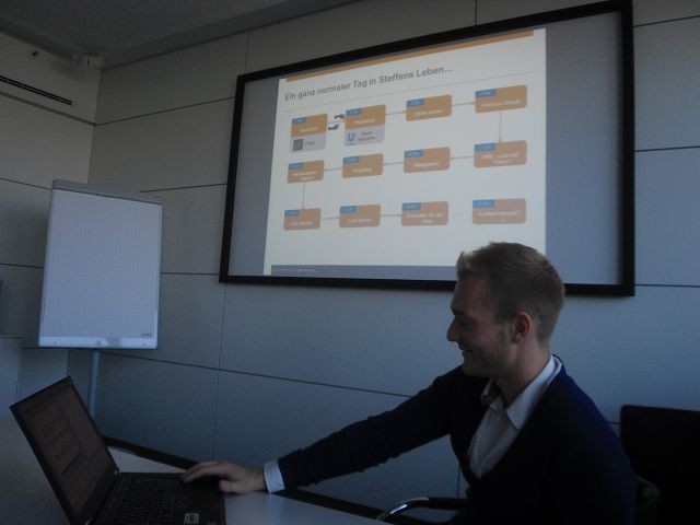 Nach diesem Rundgang trafen wir uns noch in einem Besprechungsraum zu einer kleinen Präsentation ganz zur besonderen Freude für Steffen. Lukas hatte die Geschichte „Ein ganz normaler Tag in Steffens Leben“ vorbereitet, durch die man sehen konnte, dass auch wir Tag täglich mit SAP zu tun haben.
