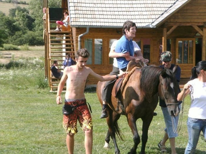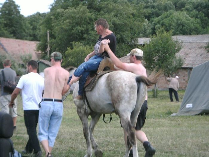 Atilla fragte Anita erneut, ob sie reiten möchte. Ihre erst ablehnende Meinung änderte sich, doch sie hatte Bedenken, die Beine nicht genug spreizen zu können, um auf dem Pferd Platz nehmen zu können. Schwub di wub , gab es eine neue Lösung. Irgendjemand kam auf die Idee, einen sogenannten Damensattel zu organisieren. Gesagt, getan und Anita saß schneller auf dem Pferd, als sie gucken konnte. Als Thomas mitbekam, dass Anita doch auf einem Pferd saß, war er zunächst etwas erstaunt, doch dann holte er schnell die Kamera, um dieses Erlebnis fest zu halten. Somar fragte auch mich, Steffen, ob ich nicht auch reiten wollte. Ich sagte ihm: „ein normales Pferd ist mir zu hoch und ein Pony würde nach spätestens zwei Metern unter mir zusammenbrechen“. Er grinste nur und meinte, bei ihm wäre dies wohl ähnlich. So ging das noch fast den ganzen Nachmittag und alle Reitwilligen hatten viel Spaß.