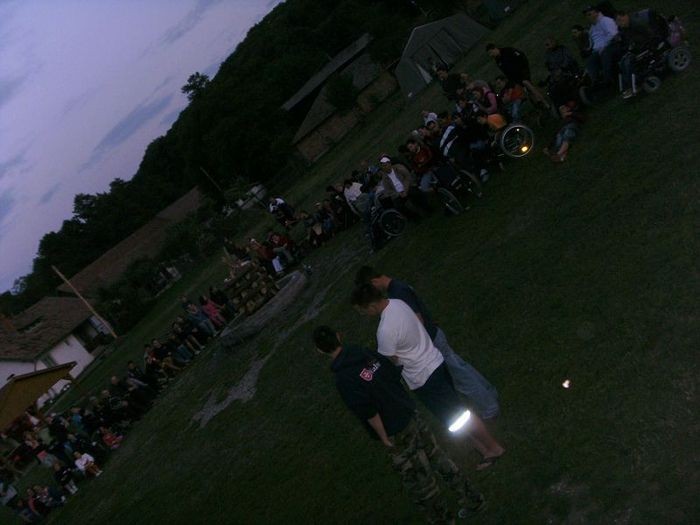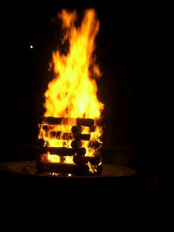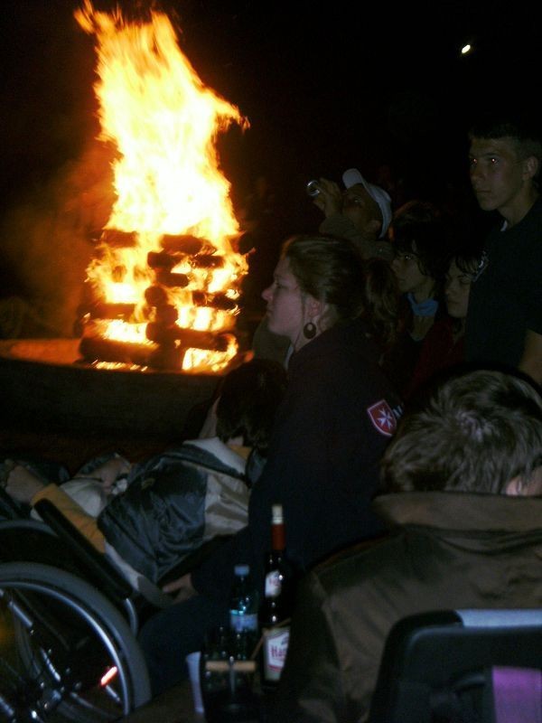 An diesem Abend stand der Karaokeabend mit Lagerfeuer an. Schon während der Reitveranstaltung bauten einige Malteser in der Feuerstelle aus Scheiten einen Holzstoß für das Lagerfeuer auf. Dafür schleppten zwei Leute einen Baumstamm auf ihren Schultern daher und mit einem Fuchsschwanz wurde der Stamm in Teile zersägt und mit einer Axt gespalten. Alle Campteilnehmer, die nicht mehr reiten wollten, konnten dann beobachten, wie die kleinen Stücke in der Feuerstelle schön aufgestellt wurden.