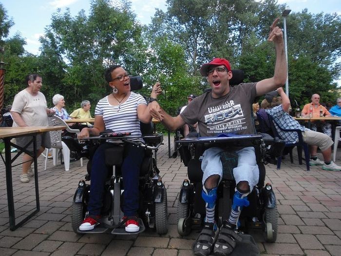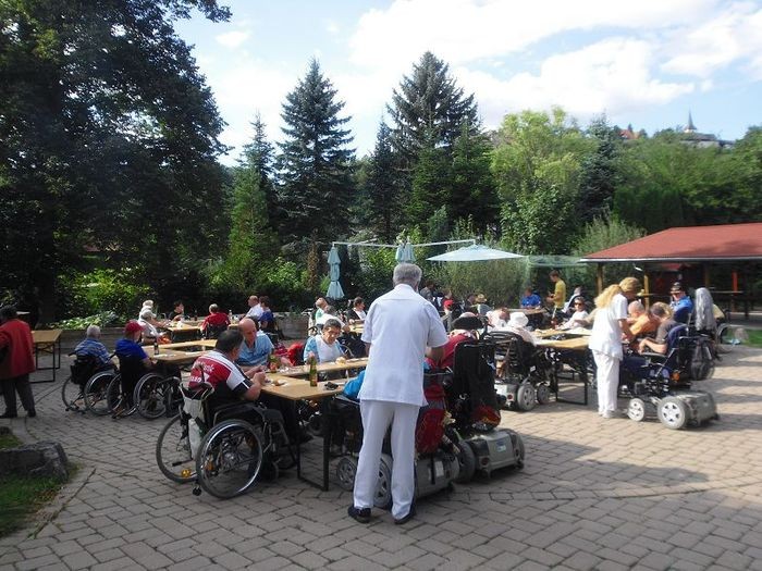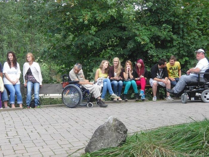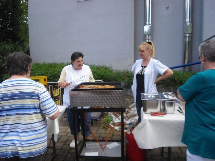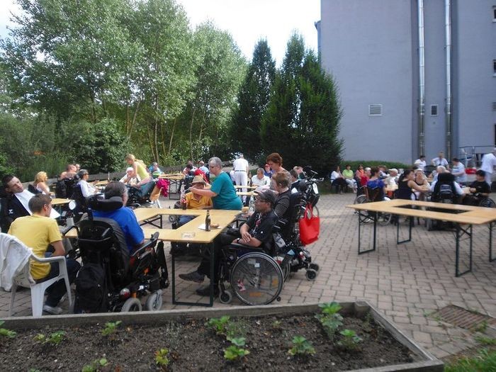 Der Auftritt sollte mit einem Grillen verbunden werden. Unsere Hausmeister, namentlich Harald und Rainer bauten am Nachmittag die Tische und Bänke hinter dem Wohnzentrum auf. Auch der Grill wurde schon mal an seine Position geschoben. Ab 16:30 Uhr füllte sich dann der Platz mit Bewohnern und Mitarbeitern. Das Wetter war optimal. Es war gerade angenehm, also nicht zu heiß. Die Band, die eigentlich für 17:00 Uhr angekündigt war, ließ auf sich warten. Erst gegen 17:30 Uhr kamen zwei Vans mit Band-Equipment auf den Hof gefahren. In der Zwischenzeit wurde der Grill angeschmissen, und Bewohner und Mitarbeiter stärkten sich schon mal für das Konzert.