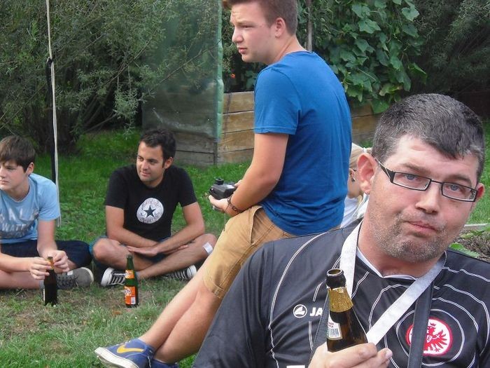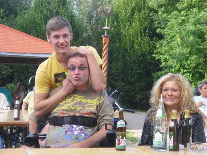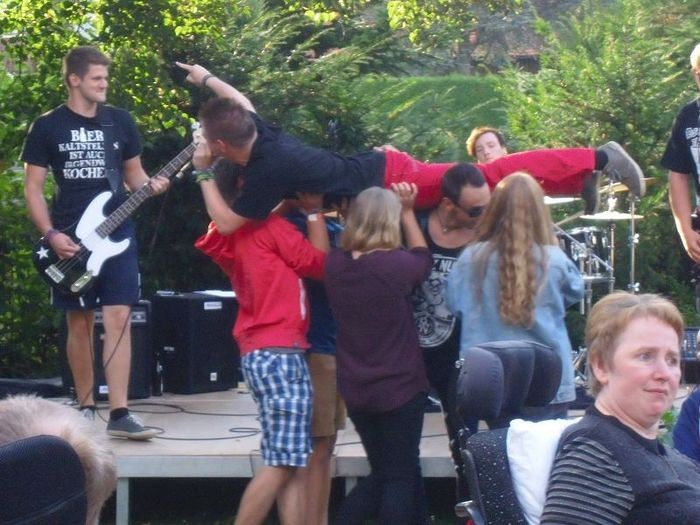 Wie gesagt, fuhren dann zwei Vans vor. Ich, Steffen sah, dass Leute ihre Instrumente ausluden. Dann bauten die Mitglieder die Sachen auf. Für meine Begriffe war die Band auch hier gut eingespielt, denn das Ganze stand schon nach 20 Minuten. Vielleicht hatte die Band Angst nicht genug Publikum zu haben, sie brachten noch einige Fans mit. Die bauten sich Stühle, direkt vor der Bühne auf. Bevor es dann richtig losging, stärkten sich auch die Bandmitglieder an unserem Grill. In dem ganzen Gewusel von Bewohnern, Mitarbeitern Bandmitgliedern und den inzwischen anderen Gästen sah ich, dass es auch schon Unterhaltungen zwischen Bewohnern und Bandmitgliedern gab.