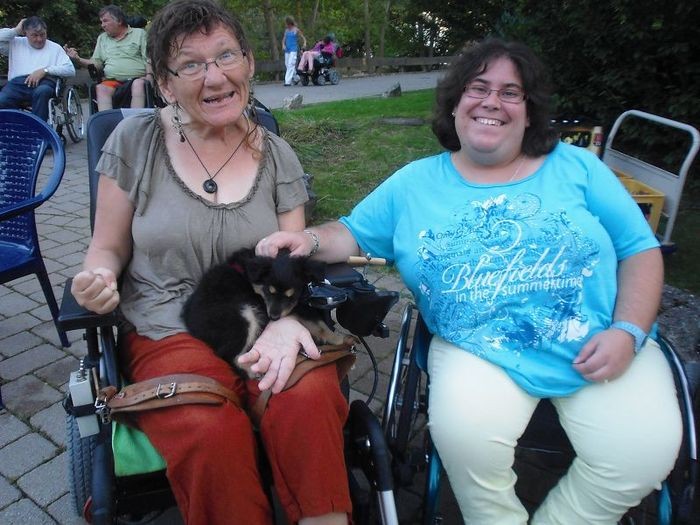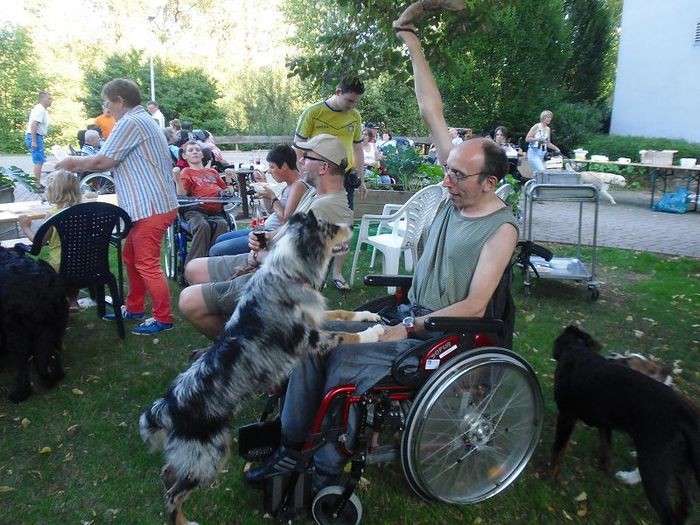 http://www.hundefreundeassamstadt.de/ auf den Platz. Für viele unserer Bewohner war die Freude groß, sich wieder zu sehen. Da die Hundefreunde schon viele Jahre regelmäßig unser Wohnzentrum besuchen, entstand schnell wieder eine lockere und vertraute Atmosphäre. Eine besondere Attraktion waren die Welpen, die von Schoß zu Schoß der Bewohner gereicht wurden und manchmal dort unter den Streicheleinheiten einschlafen durften. Schön zu beobachten ist es immer, wenn ein Hund beim Spiel einen der ruhigeren Bewohner richtig aktivieren kann. Sogar Bewohner, die sich kaum äußern können werden durch die Berührung mit den Hunden zum Lächeln gebracht.