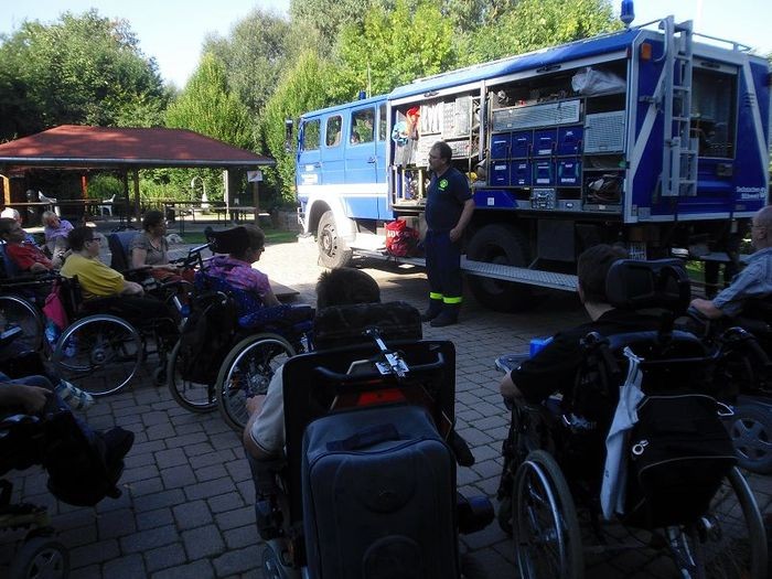 http://www.thw.de/SharedDocs/Organisationseinheiten/DE/Ortsverbaende/K/Kuenzelsau_Ortsverband.html mit Andreas Schilder am Steuer und Tim Schenkel als Beifahrer. Die beiden begannen ihre Demonstration mit geheimen Vorbereitungen auf der Rückseite des Fahrzeugs. Wir Zuschauer rätselten erst mal, was da wohl geschehen würde. Bald konnte man aber mit eigenen Augen sehen, dass ein sogenanntes Hebekissen unter ein Rad des LKWs geschoben wurde. Tim erklärte uns, dass er damit eine Last bis zu 30 t anheben könnte und dass so ein Kissen bis zu 30 cm aufgeblasen werden kann. Z. B. werden solche Hebekissen bei Bergungen eingesetzt. Wer wollte, konnte nun Druckluft per Hebel selbst in das Kissen pumpen, oder wieder ausströmen lassen. Auf der anderen Seite des Fahrzeugs erzählte Andreas erst mal Allgemeines zu den Einsätzen des THW. Danach zeigte er die Ausrüstung des LKWs. Dass die Vorführung für uns Bewohner und Mitarbeiter sehr eindrucksvoll war, zeigte sich auch an den vielen Fragen, die gestellt wurden, die Andreas geduldig beantwortete. Viel zu schnell gingen die zwei Stunden, die für die Vorführung geplant waren, um. Wir bedankten uns mit einer Einladung zum Gulaschsuppe Essen bei den Beiden, die sich bei uns an ihrem freien Nachmittag ehrenamtlich eingesetzt haben.