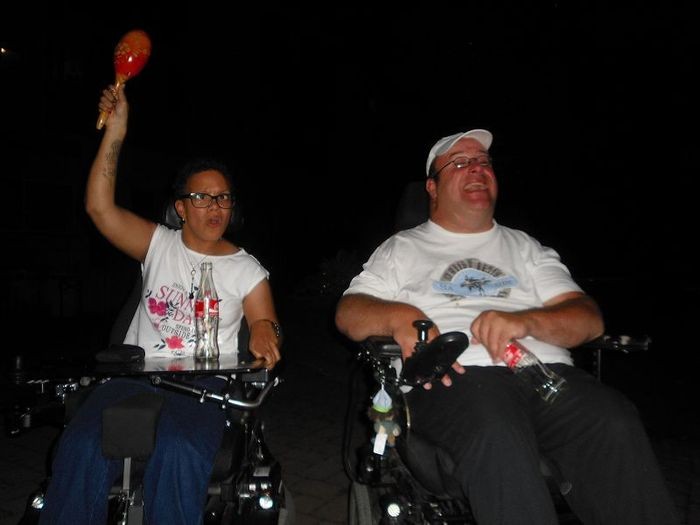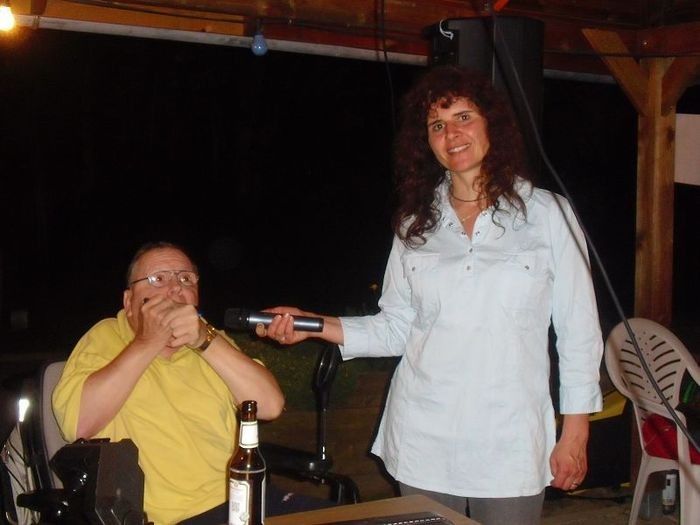 Nun stimmten uns die Sänger mit den ersten Liedern aus unserem Liedheftchen ein. Alle singfreudigen Bewohner und Mitarbeiter sangen schnell mit. Rhythmische Unterstützung mit Klanginstrumenten erhielt die Band von einigen Bewohnern. Wer hätte diesmal gedacht, dass uns noch zwei andere Bewohner mit ihren Talenten überraschen würden. Hans-Jürgen war von der Lagerfeuerstimmung so angetan, dass er spontan seine Mundharmonika hervorholte und zusammen mit der Band einige Songs spielte. Nachdem ein Bandmitglied mit einem schnurlosen Mikrofon in die Runde ging und nach freiwilligen Sängern Ausschau hielt, bekam auch Carmen Lust mit der Band zu singen. Sie schlug den Song „Sailing“ von Rod Stewart vor. Währenddessen wurde es langsam dunkel, sodass das Feuer und der Sternenhimmel eine richtig romantische Stimmung aufkommen ließen.