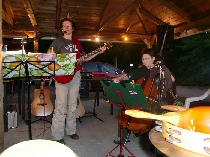 Zu unsrer Überraschung gesellte sich Sabine, Bewohnerin des Hauses mit ihrem Cello zu den Musikern und eröffnete zusammen mit ihnen den musikalischen Abend. Sanne und Sabine hatten extra dafür einige Stücke zusammen geübt. Und auch das Lied „Ein kleiner grüner Kaktus“ hatten die beiden vorbereitet.