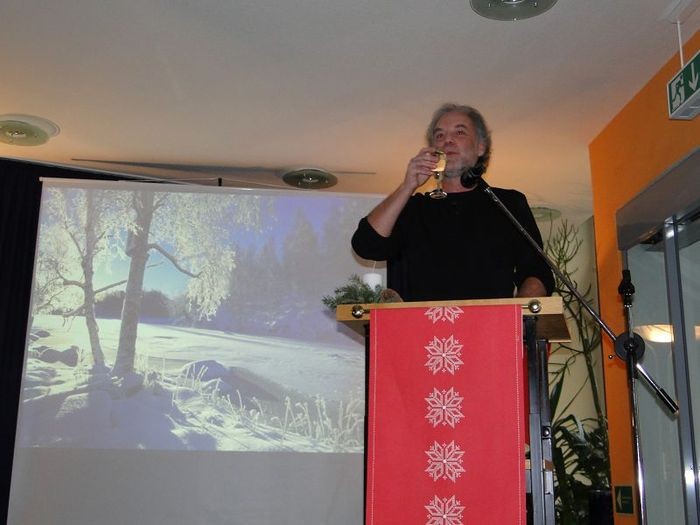 Hans-Jürgen, aus dem radioEdi Team hatte eine Weihnachtsgeschichte geschrieben, die von den Bewohnerinnen Andrea und Jutta vorgetragen wurde und die Mitglieder der Theatergruppe „Die rollenden Krautis“ trugen die Geschichte „Die Tiere im Stall“ vor. Dazu gab es passende Bilder auf der großen Leinwand im Saal zu sehen.