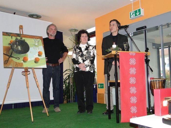 Als Gäste begrüßten wir Margarete Bauer und Hans-Joachim Bauer von der Stadt Apotheke Krautheim, die dem Wohnzentrum ein Stillleben von Michael Engelhardt mit dem Titel "die Kaschmirschale" überreichten.