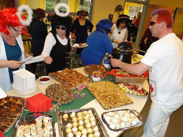 Ein besonders schönes Bild gab das Küchenteam des Wohnzentrums ab, das als Vierfach-Pippi-Langstrumpf erschien. Aber auch das Essen ließ sich sehen, unsere Gaumen wurden mit allerlei Fingerfood verwöhnt, das uns allen sehr mundete. Ein ganz herzlicher Dank an dieser Stelle dem Koch Helmut Gaab und seinem Team.