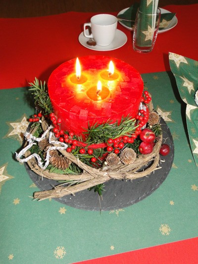 Festlichen Glanz bekam alles durch eine Tischdekoration in weihnachtlichem Rot und Grün. Eine warme Atmosphäre verbreiteten die vielen brennenden Kerzen, die Carmen Würth zu unserer Feier beisteuerte.