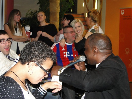 Nun stellte sich die Frage: Kann man bei einer Weihnachtsfeier Party machen? Die Antwort ist eindeutig ja. Frank Riley von der Gruppe "SheepWalk" stimmte uns mit black & white Partymusik ein. Seine tolle Stimme hat uns verzaubert und gleich mitgerissen. Abgegraste Tische mit leeren und vollen Flaschen wurden kurzerhand an die Wand gerückt. Auf der freien Fläche versammelten sich schnell Bewohner und Mitarbeiter, jetzt konnten schon die ersten Kalorien vom Abendessen verbrannt werden. Tanzen war angesagt! Bewohner, Mitarbeiter und Gäste feierten miteinander in ausgelassener Stimmung.