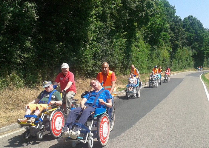 Jeweils acht Bewohner und acht tatkräftige Fahrradfahrer radelten gemeinsam mit einem Gespann aus Rollstuhl und Fahrrad durchs romantische Erlenbachtal.