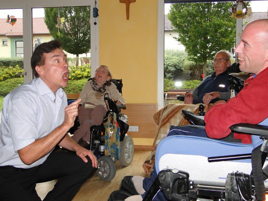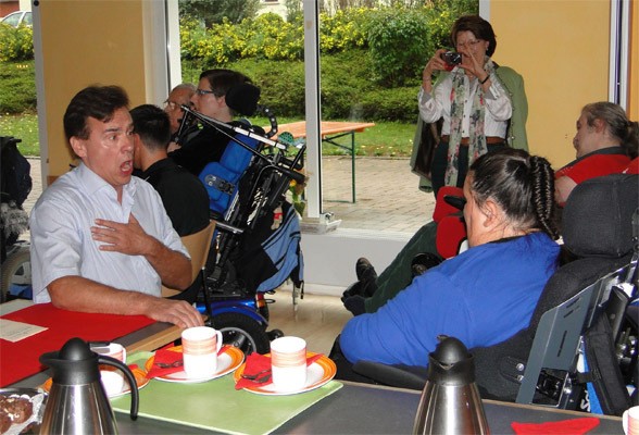 Punkt 16:00 Uhr begrüßte Jürgen Milewski, Vorsitzender der Bewohnervertretung des Eduard Knoll Wohnzentrums alle Anwesenden. Als besondere Gäste erwähnte er Marie-Luise Biedermann und Frau Bauer aus Krautheim vom Hilfswerk Sankt Fortunat e.V,