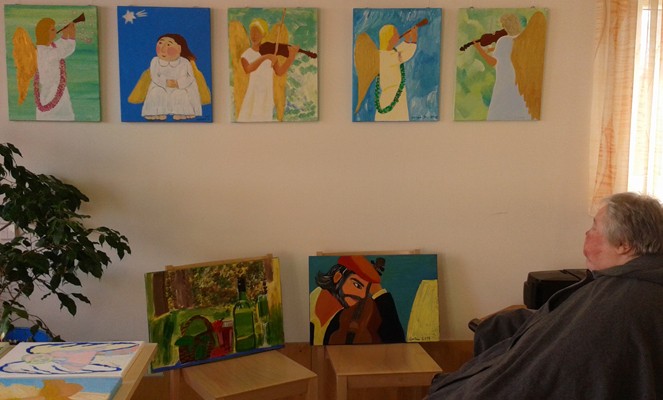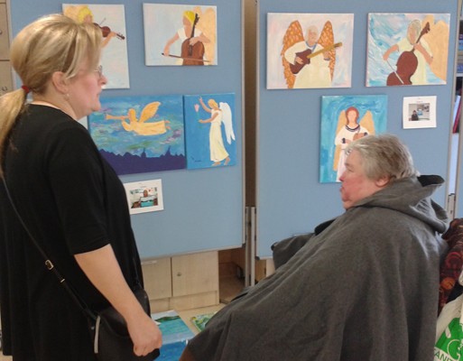 So langsam war es Zeit, dass wir uns auf den Heimweg machten. Dabei entdeckten wir aber noch ein Schild mit dem Hinweis zu einer Ausstellung der Malgruppe „Geistreich“. Das wollten wir uns dann doch nicht entgehen lassen. In einem kleinen Raum waren viele Bilder, hauptsächlich zum Thema „Engel“ ausgestellt. Mich hat es sehr beeindruckt, wie die Künstler mit Behinderung ihre eigenen Ideen umgesetzt haben. Eine schöne Überraschung war für mich, ein bekanntes Gesicht unter den Künstlern zu entdecken.