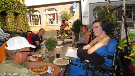 Um 16:00 Uhr trafen wir uns alle hinter dem Haus und stiegen in den Bus ein. Georg war unser Fahrer und Serdar unser Begleiter. Unsere erste Anlaufstelle in Niederstetten war die Pizzeria „Rizza Pizza“, dort hatte ich im Voraus einen Tisch reserviert. Als ich aus dem Bus stieg, war ich etwas verwundert, wie groß die Einkausfsstraße eigentlich ist, da ich mit einem kleineren Ort gerechnet hatte. Bis 19:00 Uhr hatten wir Zeit, gemütlich unser Essen, in der schönen Atmosphäre und bei herrlichem Wetter zu genießen. Danach schlenderten wir Richtung Veranstaltungsgebäude, zur „Alte Turnhalle“. Für uns war es optimal, dass die Halle bereits geöffnet war, so konnten wir gute Plätze ergattern. Um kurz nach 20:00 Uhr eröffneten „Die Füenf“ das Konzert mit dem Lied „5 Engel für Charlie“. Schon beim ersten Lied sprang der Funke auf das Publikum über. Die fünf Musiker brauchen keine Instrumente, sondern ersetzen diese durch ihre Stimmen. Sie sind eine a-cappella-pop-comedy Band. In ihren neuen Liedern singen sie über alle möglichen und unmöglichen Themen. Besonders lustig fand ich, dass sie auch ein Lied über Neurodermitis geschrieben haben, da ich als Kind selbst davon betroffen war. Was mich auch ziemlich beeindruckte war, wie man auf so eine verrückte Idee kommen kann, über den „Thermomix“ zu schreiben.