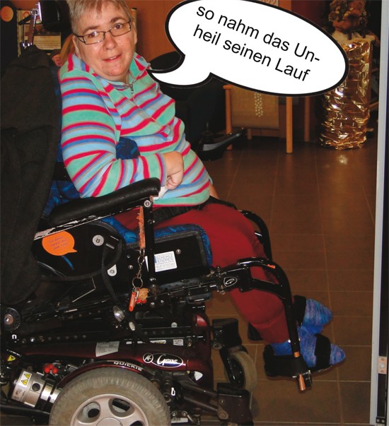 Darauf bombardierte ich ihn mit Fragen: “ Wie lange tut es weh?“ etc. meine Schmerztoleranz sei nämlich sehr niedrig. Doch zwischen uns herrschte von Anfang an eine Art Verbindung, er verstand und ich verstand ihn. Also, versprach er mir, so gut wie möglich zu helfen. Ich sei nicht die 1. Spastikerin, die er operieren würde. Kurz und gut: Die OP ist super gut gelaufen. Bei den tägl. Visiten sagten mir Alle, ich hätte einen tollen Humor und sei ein toller Mensch. Mit der Krankengymnastin (KG) übte ich ab dem fünften Tag täglich das Sitzen auf dem Bettrand und bekam eine automatische Bewegungsschiene. Schon am 2. Tag meinte ich zur KG: „Gib Gummi, ich will Alles! Sie meinten nur: „Frau Gotthard, das tut aber weh.“ Doch meine Antwort war: „Laber nicht, mach!“ Ich zog es tatsächlich durch. Sie gaben mir 10 Tage um wieder im Rolli sitzen zu können, geschafft habe ich in Drei!!