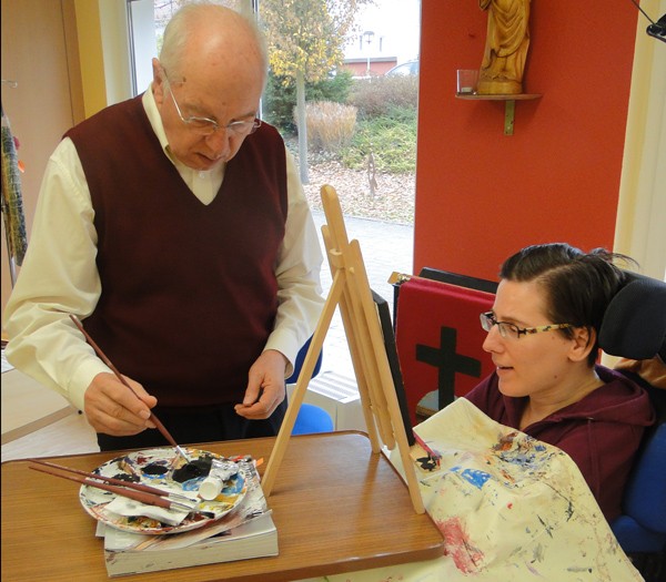 Letztes Jahr im Herbst lernte ich dann bei einer Veranstaltung Erich als Begleitung kennen. Er war mir sofort sympathisch und da kam mir die Idee zu fragen, ob er sich vorstellen könnte, mit mir zu malen. Zuerst war er etwas skeptisch, doch als ich ihm näher erklärte, dass er mir nur beim Farbeaufnehmen, Pinsel in den Mund stecken und nach Bedarf das Bild verschieben, helfen muss, entschloss er sich, es auszuprobieren.
