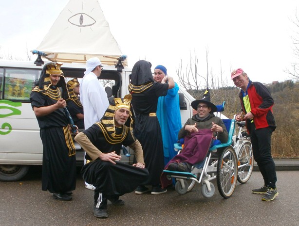 Am Samstagvormittag den 4. Februar erwartete mich ein großes Abenteuer. Georg Kleiner und ich, Alberto, rollten so um 10:00 Uhr vom Eduard-Knoll-Wohnzentrum (EKWZ) in Richtung Mulfingen mit dem Rollfiet los. Unser Ziel war der „Tauben Markt“, mit dem in der Region beliebten großen Umzug. Wir sind gleich hinter unsrem Haus auf dem Fahrradweg, der direkt an der Jagst entlangführt, losgefahren. Während der Fahrt hat mir Georg Geschichten aus der Landwirtschaft erzählt, z.B. wie die Leute früher gearbeitet haben. Dabei verflog die Fahrtzeit schnell und nach fast zwei Stunden kamen wir in Mulfingen an. Ich war allerdings froh, gut eingepackt gewesen zu sein.
