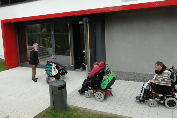 Bei unserer Führung haben wir festgestellt, dass der Haupeingang nicht mit einer automatischen Türe ausgestattet ist. Wir möchten aber ausdrücklich noch darauf hinweisen, dass über den Eingang zwischen der Andreas-Fröhlich-Schule und dem Bürgerhaus- Mensa über die selbstöffnende, automatische Türe für einen ungehinderten rollstuhlgerechten Zugang in das Eugen-Seitz-Bürgerhaus gesorgt wurde.