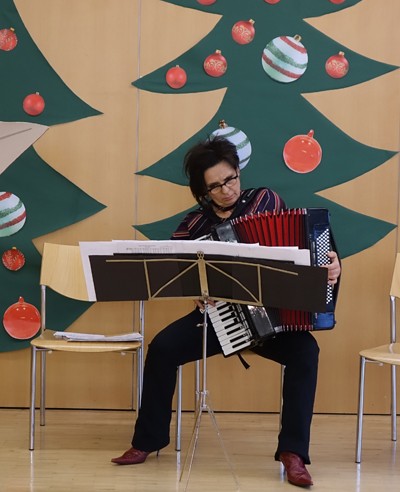 Die drei Musiker brachten ein festliches und weihnachtliches Programm mit. Gleich zum Einstieg luden sie alle Gäste zum gemeinsamen Singen eines Weihnachtsliedes ein.