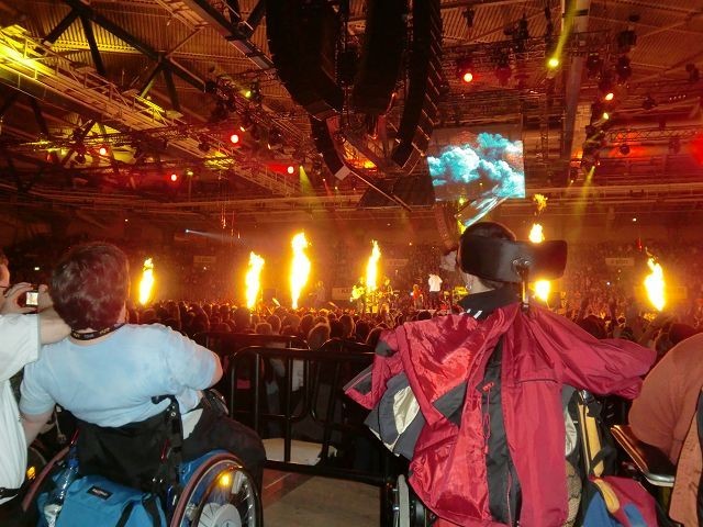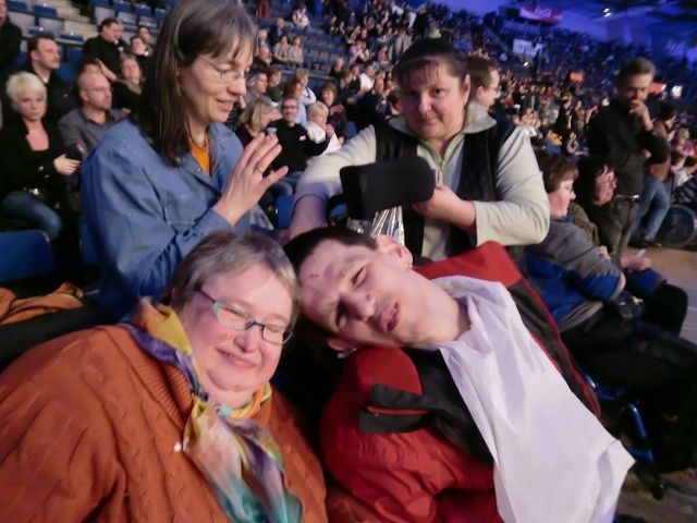 Am späten Nachmittag des 28. November machten sich auch zwei Busse mit jeweils vier Bewohnern des Eduard Knoll Wohnzentrums und vier Begleitpersonen auf den Weg nach Stuttgart. Wir kamen gut dort an und waren schnell auf unseren Plätzen, die hervorragend waren. Das Konzert konnte beginnen. Und wie es begann: Mit einem Feuereffekt, welcher sich in anderen Formen über die ganze Show verteilte, begann die Gruppe ihr Konzert.