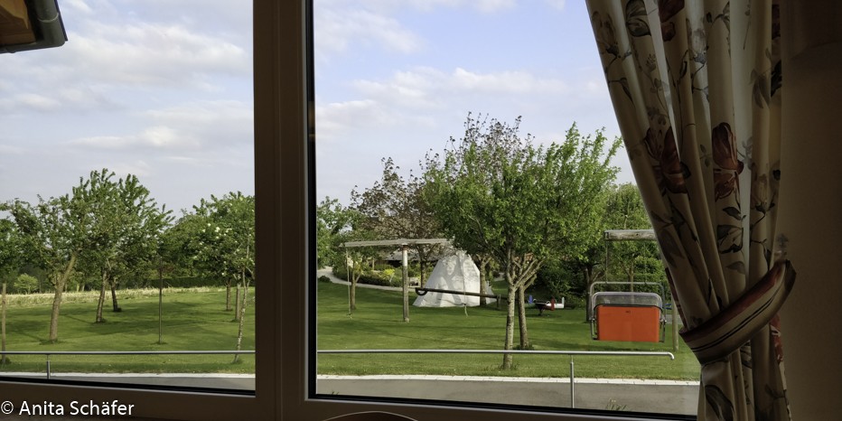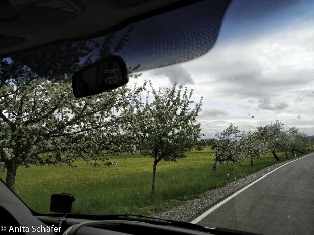 Juhuuu, wir haben URLAUB riefen wir alle durcheinander. Bei Schwäbisch Hall fuhren wir auf die Autobahn in Richtung Ulm und kurz hinter Ulm konnten wir sie schon wieder verlassen. Es wurde immer ländlicher, die Straßen immer schmaler, bergauf und bergab, an blühenden Wiesen mit Kühen vorbei und durch frühlingsgrüne Wälder. Ab und zu ertönte fröhlich unser Lieblingswort URLAUB durch unser „Riesenschiff“ (Bus) das Uschi erfolgreich lenkte. Gut, dass es Navis gibt wegen dieser speziellen Ortsnamen wie, Hübscher, Höchster, Hasenenweiler usw. (in Hasenweiler fand vom 3. bis 6. Mai ein Maifest statt, das lasen wir auf einem Plakat, das uns während der Fahrt immer wieder mal begegnete. Annika hatte sich versprochen und sagte „Hasenfest in Maiweiler“).
