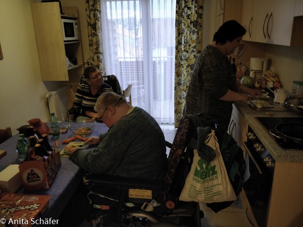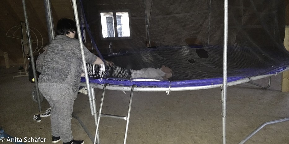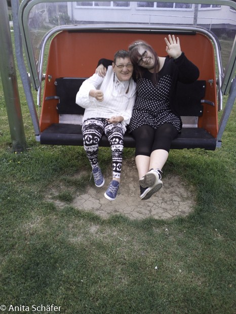 Endlich erreichten wir um ca.15:00 Uhr unseren Urlaubshof Scherer in Deggenhausertal. Wir waren fest davon überzeugt, dass der Ort so heißt. Wir peilten erst mal die Lage und beim Umschauen entdeckten wir verschiedene Wegweiser. Schon begegneten wir Herrn Scherer, der uns herzlich begrüßte und den Schlüssel für unsere Ferienwohnung, mit dem Namen Nelke zeigte. In diesem Wohnhaus waren mehrere große Ferienwohnungen. An der Tür zu unserem Apartment stand: Familie Schäfer, ich hatte also mal so eben eine ganze Familie bekommen. Bevor wir einzogen, mussten wir erst mal noch ein paar Möbel rücken. Das Bett, das für Jutta gedacht war, stand im Ess-Wohnbereich. Also stellten wir ein bisschen um, um Platz für den Lifter zu schaffen. Während Uschi, Annika und Heiko unser Gepäck in die Wohnung brachten, schauten wir uns noch das Gelände ein bisschen genauer an. Es gab hinter dem Haus verschiedene Schaukeln, ein Drehkarussell, zwei Grillplätze, einen kleinen Teich mit Bank, einen kleinen Kräutergarten, eine Kletterwand, einen Sandkasten und ein Tipi. Ach ja! Auch ein Hallenschwimmbad gab es noch. Dann entdeckte Heiko die Spielscheune. Sie ging über drei Etagen und schloss direkt ans Wohnhaus an, so dass man sie vom Wohnhaus über eine Verbindungstür, sogar mit Rolli, gut erreichen konnte. Dort konnte man sich am Trampolin, an einem Boxsack und an anderen Geräten für große und kleine Kinder austoben. Wer keine Lust zum Treppenlaufen hat, kann vom Dachboden aus ins Erdgeschoss hinunterrutschen.