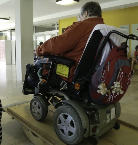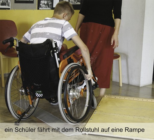 Da im Eduard Knoll Wohnzentrum die meisten Bewohner in einem Rollstuhl sitzen, sollte dieses Hilfsmittel während des Projekts zum Thema gemacht werden. Für die meisten Schüler wird der Rollstuhl aber erst richtig interessant, wenn sie ihn einmal als „Sportgerät“ ausprobieren dürfen. Zu diesem Zweck wurde jahrelang ein Hindernisparcour in der Realschule aufgebaut, bei dem die Geschicklichkeit geübt werden konnte. Bei dieser Gelegenheit bekamen die Schüler einen Eindruck von der sportlichen Herausforderung, die Rollstuhlfahrer zu bewältigen haben, die sich in einem Schieberollstuhl fortbewegen. Die Schüler lernten zudem den Umgang mit einem Rollstuhl kennen. Beispielsweise wie man eine Treppe überwindet oder welche Unterschiede es bei den verschiedenen Schieberollstühlen und Elektrorollstühlen gibt.
