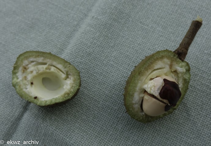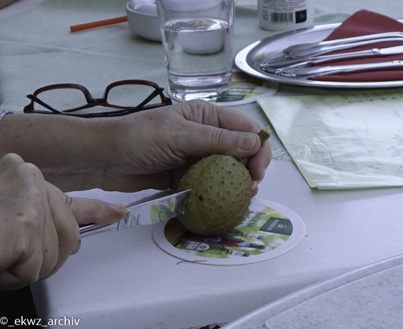 Wir genossen es, draußen zu sitzen und unsere gesellige Runde unterhielt sich angeregt. Plötzlich bemerkte jemand einen „seltsamen“ Baum mit einer „merkwürdigen“ Frucht. Allgemeines großes Rätselraten entstand, denn „Radioleute“ sind ein neugieriges Volk. Kurzerhand wurde das Gewächs vom Baum geholt und aufgeschnitten. Da kam auch schon die Wirtin mit den ersten Essen und löste das Rätsel auf, es handelte sich um eine Rotkastanie. Also davon hatten die wenigsten von uns schon mal was gehört.
