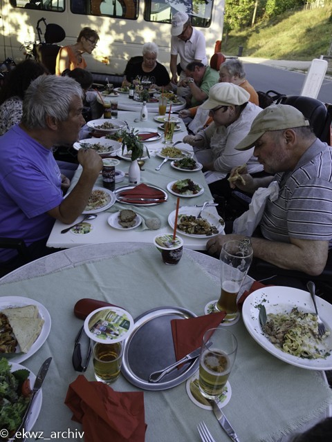 Jetzt brachen die Gespräche nach und nach ab und es herrschte nur noch gefräßige Stille. Das Essen war köstlich, sehr lecker, es war alles frisch zubereitet und mit frischen Kräutern garniert. Der Küchenchef kam auch zu uns und er freute sich sehr über unsere großen Komplimente. Er erinnerte sich auch noch gut daran, als wir bei unserem Rollfietausflug vor vier Jahren bei ihm eingekehrt waren.