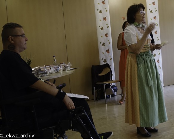 „Ich tanze mit dir in den Himmel hinein“ war die Zugabe. Frau Biedermann, die erste Vorsitzende des Hilfswerk St. Fortunat, die um ein Grußwort zu sprechen schon bereitstand, wurde einfach so zum Walzer auf´s Parkett geführt. Zusammen mit der Sängerin schwang sie das Tanzbein. Die letzte Zugabe war das bekannte Lied „die Caprifischer“, dieses Mal für alle zum Mitsingen. Die Stunde war wie im Flug vergangen.
