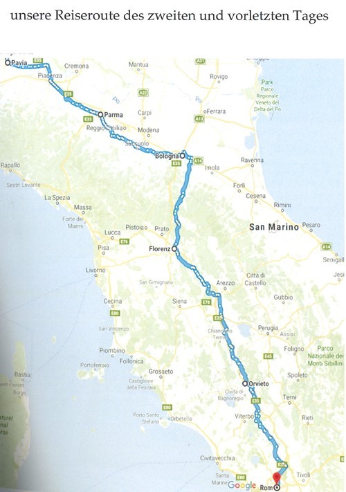 Das erste Etappenziel war die Stadt Pavia in der Nähe von Mailand. Dort haben wir zu Abend gegessen, übernachtet und uns am nächsten Morgen gleich wieder auf die Weiterreise gemacht. Am Sonntag erreichten wir dann gegen 17:30 Uhr Rom. Es war wieder sehr beeindruckend, dass wir uns auf einem großen Platz mit den anderen Reisebussen trafen und im Konvoi, der von Carabinieris begleitet wurde, unser Domizil anfuhren. An der Fahrt durch die pulsierende Stadt hatte ich sehr viel Freude. Untergebracht waren wir wieder alle im Fraterna Domus, einem modernen barrierefreien Gebäude.