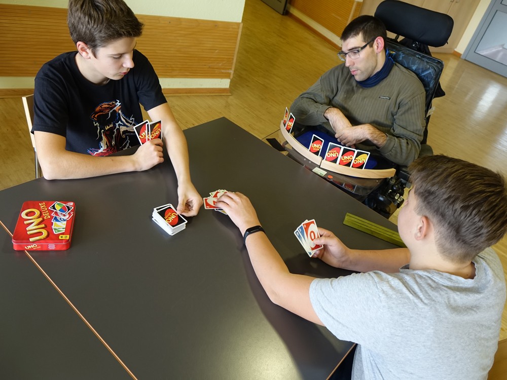 Alberto interessiert noch, ob die Schüler gut mit ihm zurechtkommen. „Ja auf jeden Fall“, bestätigen beide, und ergänzen: „Bis jetzt waren wir zusammen einkaufen, sind einfach spazieren gegangen, haben in der Tagesstrukturierung gebastelt und „Mensch ärgere dich nicht“ gespielt.“