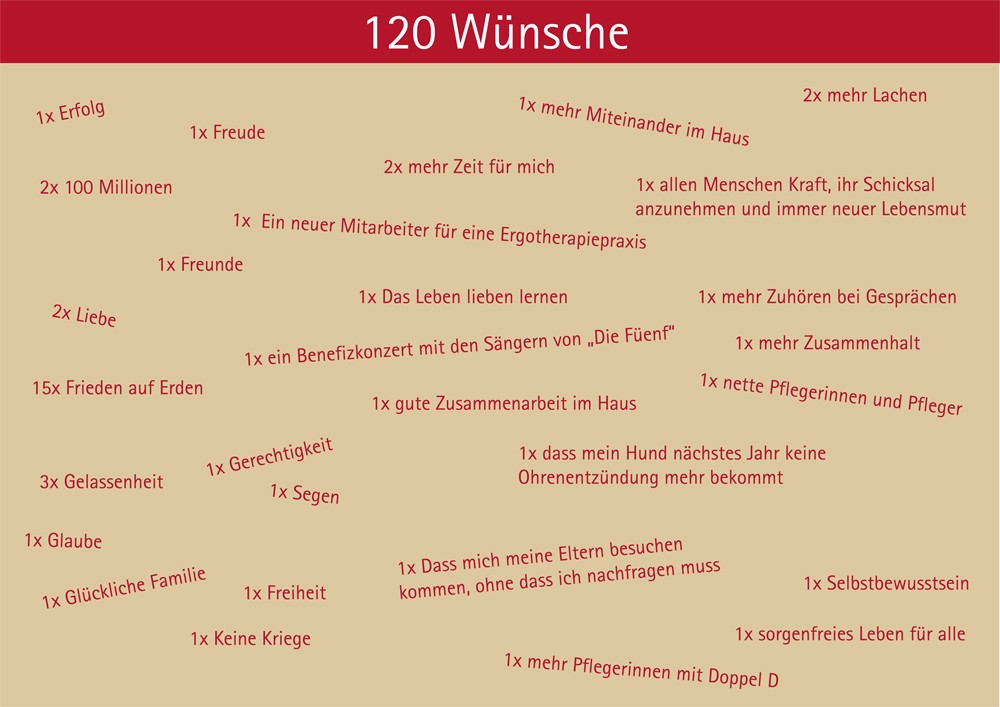 Trotz meiner mutigen Aktion war ich am Abend eher unzufrieden, da ich nicht sicher war, ob es bei den Konzertbesuchern gut angekommen ist. So beschloss ich, einen Tag später, an unserer Weihnachtsfeier meinen Job als Weihnachtsengel zu verlängern. Ich dachte mir, dass an der Feier bestimmt noch viele Wünsche zusammen kommen würden. Wieder hatte ich eine fleißige Helferin, die mich beim Ansprechen der Leute unterstützte. Die Reaktion war sehr groß und viele Bewohner, Mitarbeiter und Besucher waren fleißig am Ausfüllen der Wunschzettel, sodass man am Ende des Abends Mühe hatte, Zettel in die Box zu werfen, so voll war sie schon.