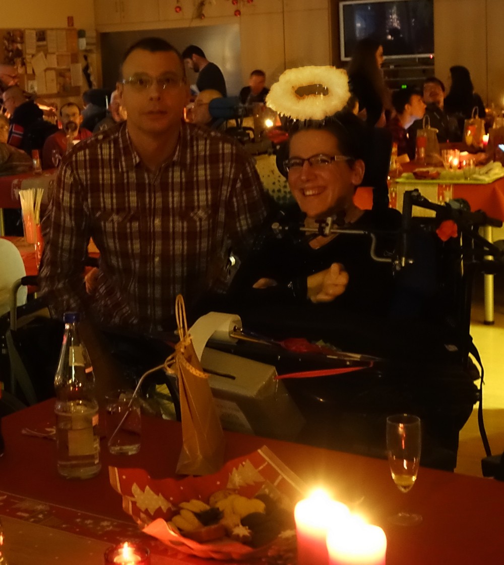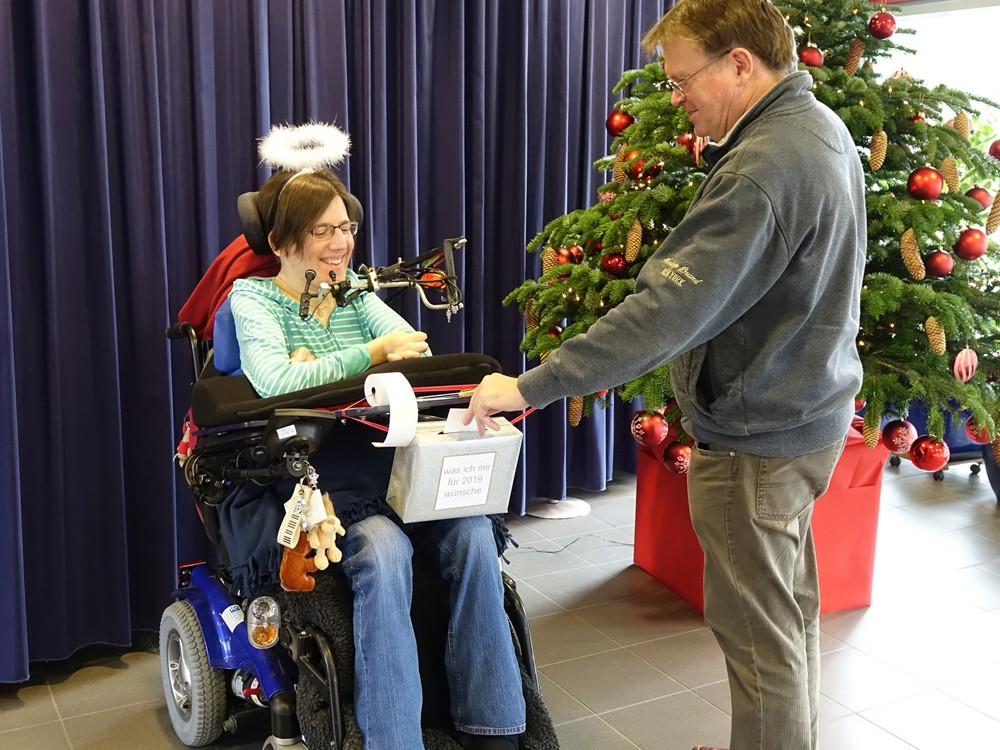 Heute möchte ich euch von meinem Job als Weihnachtsengel berichten. Angefangen hat alles am Nikolaustag, als wir in unserem Haus den Weihnachtsmarkt hatten. In der Tagesstrukturierung sah ich einen Heiligenschein liegen und da kam mir spontan die Idee, diesen aufzusetzen. An diesem Abend sprach mich die Mutter eines Bewohners auf meine Verkleidung an. Ich sagte ihr spontan: „Ich bin der Weihnachtsengel und sammle Wünsche für das Christkind.“ Da hatte sie die Idee, dass ich unbedingt noch eine Box brauche, um die Wünsche dort sammeln zu können. Und so kam es zustande, dass ich in die Rolle des Weihnachtsengels schlüpfte.