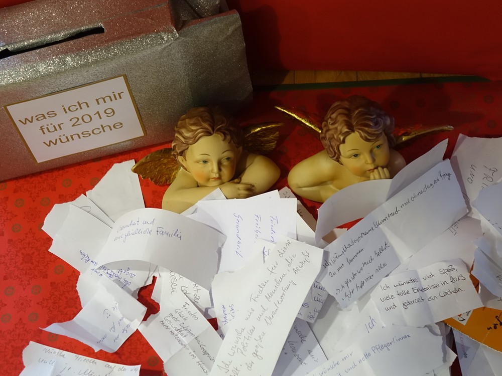 Am Donnerstag, den 13. Dezember begann ich meinen Job als Weihnachtsengel. Mit einem mulmigen Gefühl startete ich meine Aktion, weil ich mittlerweile Bedenken bekommen hatte, ob mein Vorhaben auch gut bei den Anderen ankommt. Trotz aller Zweifel war ich mutig genug, durch´s Haus zu „schweben“ um die ersten Personen anzusprechen. „Ich bin heute als Wunschengel unterwegs und sammle Wünsche für 2019“, sagte ich und schon purzelten die ersten Wunschzettel in meine Box. Viele im Haus waren von meiner Idee sehr begeistert und so füllte sich mein „himmlischer Briefkasten“ schnell.