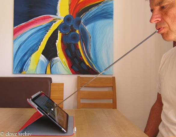Reiner Scheuermann: Ich habe vor vielen Jahren bereits einen Mundstab zum Umblättern angefertigt. Da dieser im Laufe der Jahre nun verschlissen war, wurde ich von dem Benutzer wieder kontaktiert und gebeten ihm einen neuen anzufertigen. Während der Herstellung dachte ich mir, es müsste doch möglich sein, mit so einem Stab auch moderne Medien wie Computer, Handys und IPAD zu bedienen. Dann begann ein langes herumprobieren, verbessern, wegwerfen und wieder von vorne anfangen, bis die Stäbe die gewünschten Anforderungen erfüllen. Sie sollen bequem sein, die Zähne nicht beschädigen, super funktionieren und es soll alles bedient werden können, was mit einem Finger auch möglich ist. Und wir hören zur unserer Freude nun ganz oft, dass die Hilfsmittel das können.