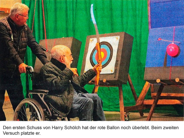 Beim ersten Schuss führt der erfahrene Bogenschütze und Trainer Eberhard Mugler Harry Schölch noch die Hand, hilft den Pfeil anzulegen und zu spannen. „Den Bogen gut spannen und Daumen weg von der Sehne", erinnert er den Senior im Rollstuhl. Der zielt, spannt, lässt die Sehne los - und der Pfeil bohrt sich mit einem leisen „Tock" in die Scheibe, knapp neben dem Luftballon.