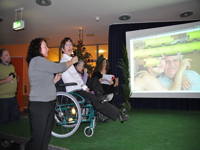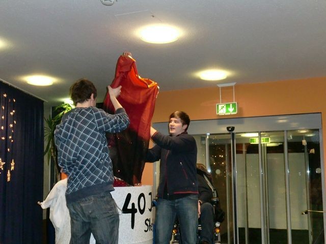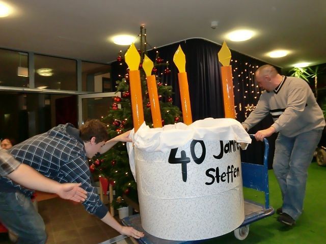 Jetzt wurde es für Steffen Vetter spannend. Schon lange hatte er angekündigt alle zu seinem 40-sten Geburtstag einzuladen. Da das aber zufällig der Termin unserer Weihnachtsfeier war, war es an uns, ihm an diesem „doppelten“ Fest eine Freude zu bereiten. Bis fast zum Schluss ahnte er nichts von den Plänen, die einige Bewohner für ihn machten. Nachdem Steffen auf die Bühne gebeten wurde, lasen vier Bewohnerinnen (Jutta Zitzwitz, Anita Schäfer, Biggi Gotthardt und Rosy Binder) abwechselnd das Gedicht „Potente Wünsche“ vor.