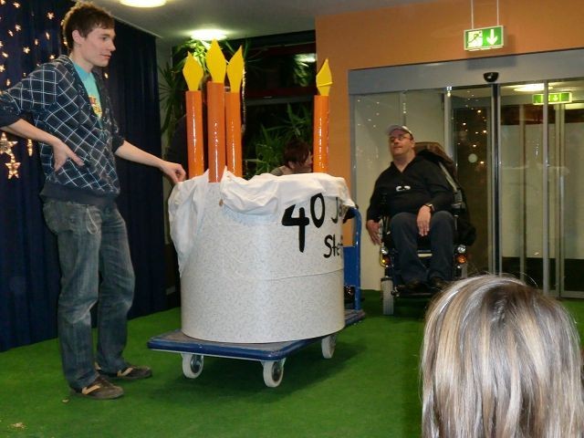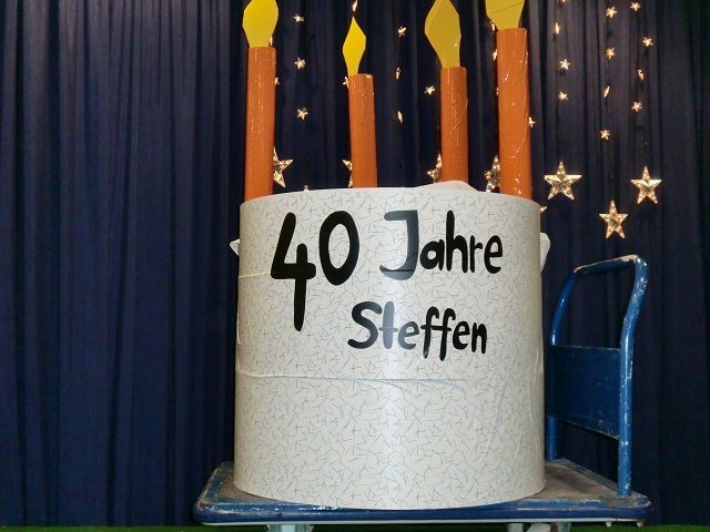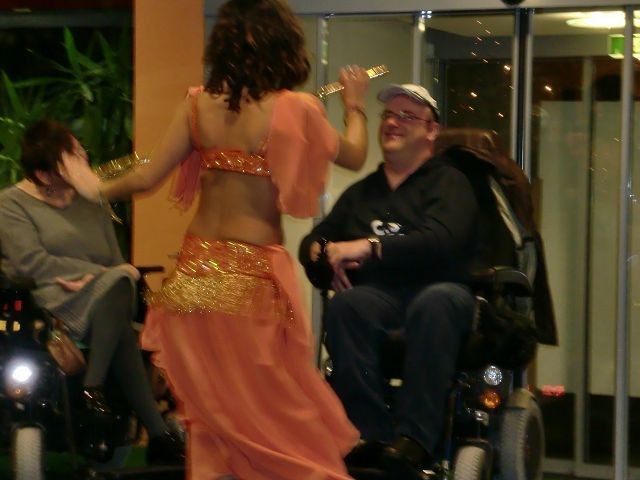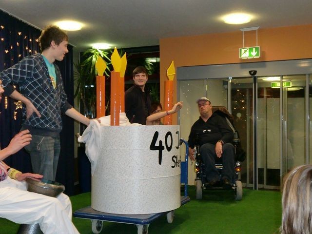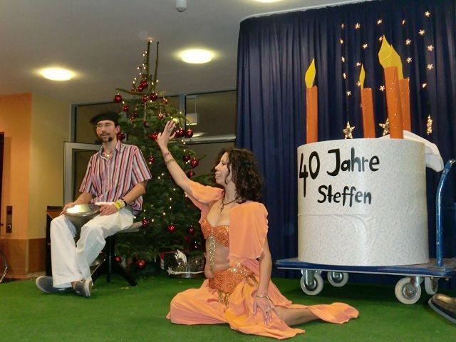 Auf die Bühne wurde nun eine riesige Torte hinaufgerollt und ihr entschlüpfte eine sehr zierliche Bauchtänzerin, die nicht nur Steffen mit ihren Darbietungen eine große Freude machte, auch die anderen Bewohner und Mitarbeiter waren sehr begeistert. Die Tänzerin, Aura Dürr, wurde vom Bongospieler, Adrian Hackenbeck, rhythmisch begleitet.