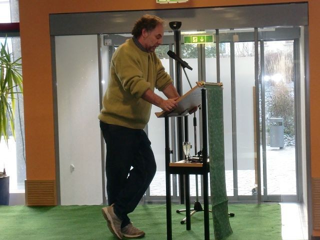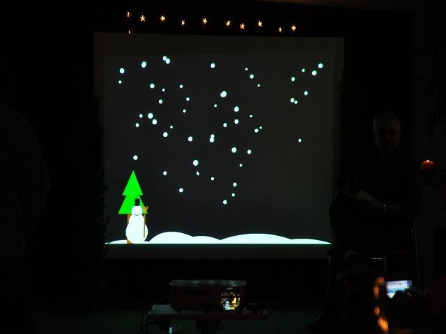Wie es einem ergehen kann, wenn es ununterbrochen schneit, berichtete Thomas Porep, Pflegedienstleiter des Hauses in der Geschichte „Schnee im Dezember“. Im Hintergrund lief eine Animation von unserem Zivi Michael Haak, in der es passend zum Stück immer mehr schneite.