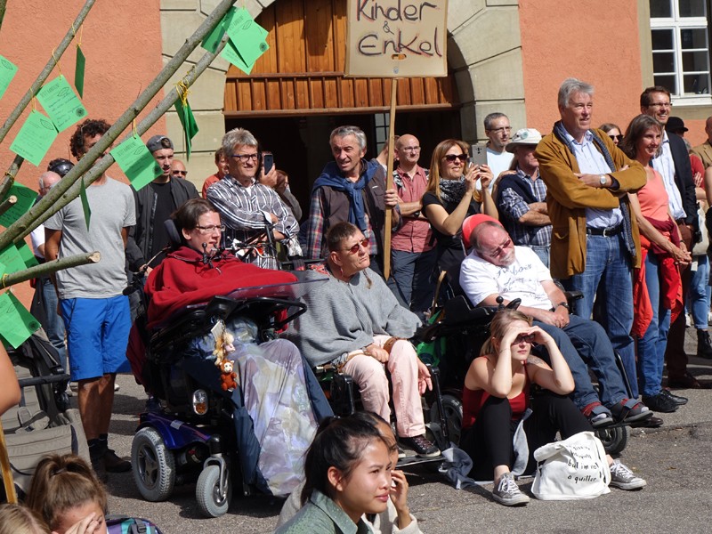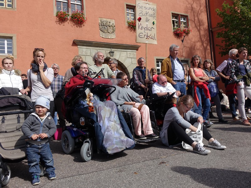 In Künzelsau angekommen schlossen wir uns bei den Demonstranten an. Durch die rege Teilnahme bekamen wir leider gar nichts von den Motivationsreden mit. Dafür konnten wir uns aber beim Marsch zum Schlossplatz mitten ins Getümmel stürzen. Die jungen Organisatoren ließen sich viele unterhaltsame Programmpunkte, unterwegs aber auch am Schlossplatz, einfallen, mit denen sie uns das ernste Thema anschaulich vor Augen geführt haben. Das hat uns gezeigt, dass es wichtig ist, bei solchen Aktionen mitzumachen aber auch selbst zu versuchen etwas zu Veränderungen beizutragen.