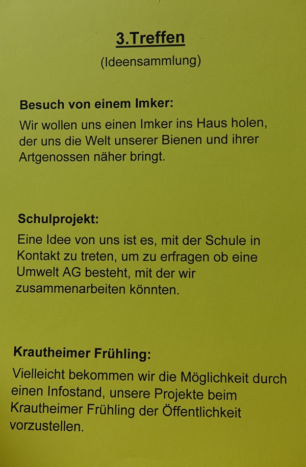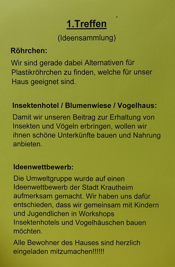 Sofort ging ich am nächsten Tag in die Öffentlichkeitsarbeit und erzählte euphorisch von meinen Plänen. Die Mitarbeiterin war ebenfalls sehr begeistert und im weiteren Gespräch kamen wir auf die Idee, ob es nicht sinnwoll wäre, hier im Haus eine Umweltgruppe zu gründen.