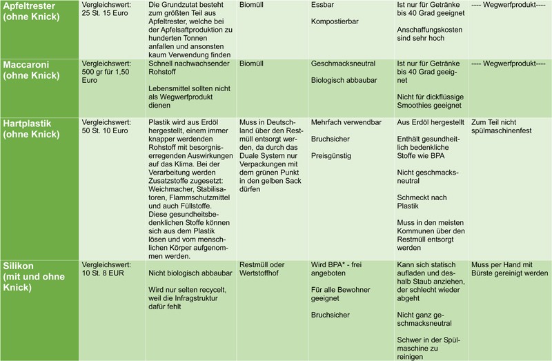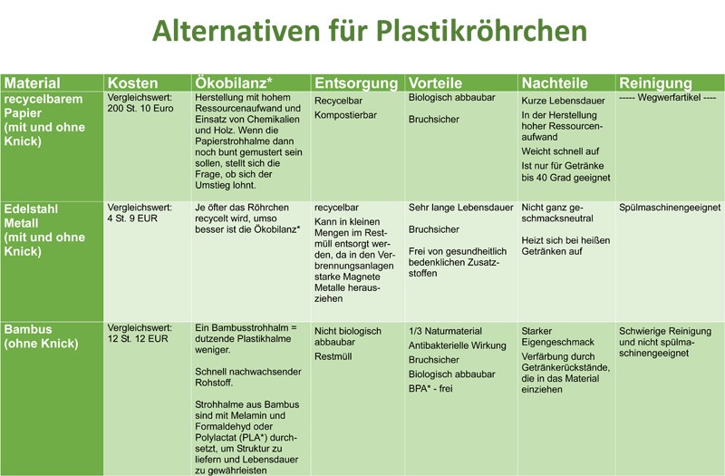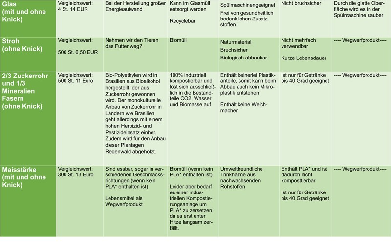 Um uns genau ein Bild machen zu können, was es überhaupt für Alternativen gibt, stellte ich mir die Aufgabe, zusammen mit den Mitarbeitern der Öffentlichkeitsarbeit und der Tagesstrukturierung eine Tabelle mit dem „Für und Wider“ der Alternativen für Plastikröhrchen zu erarbeiten.