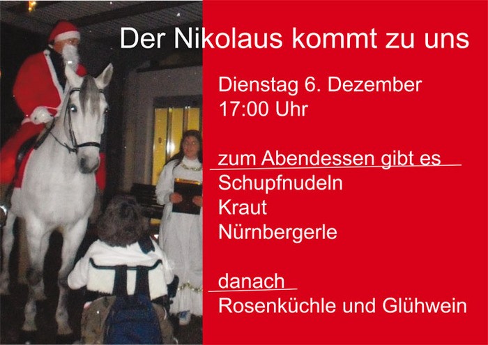 Am 6. Dezember um 17:00 Uhr wird der Nikolaus auch zu uns ins Eduard-Knoll-Wohnzentrum kommen. Zusammen mit seinem Begleiter, dem mit einer Rute &quo...