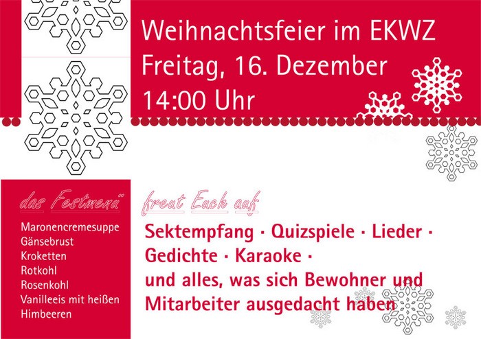 Liebe Bewohner und Mitarbeiter, am 16. Dezember 2011 laden wir alle ganz herzlich zu unserer Weihnachtsfeier ein. Ab 14:00 Uhr ist der festlich gesc...