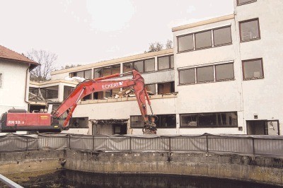 Abbrucharbeiten am ehemaligen Schwimmbadgebäude haben begonnen Der Abriss-Bagger hat schon kräftig zugebissen. In der Fassade klafft ein r...
